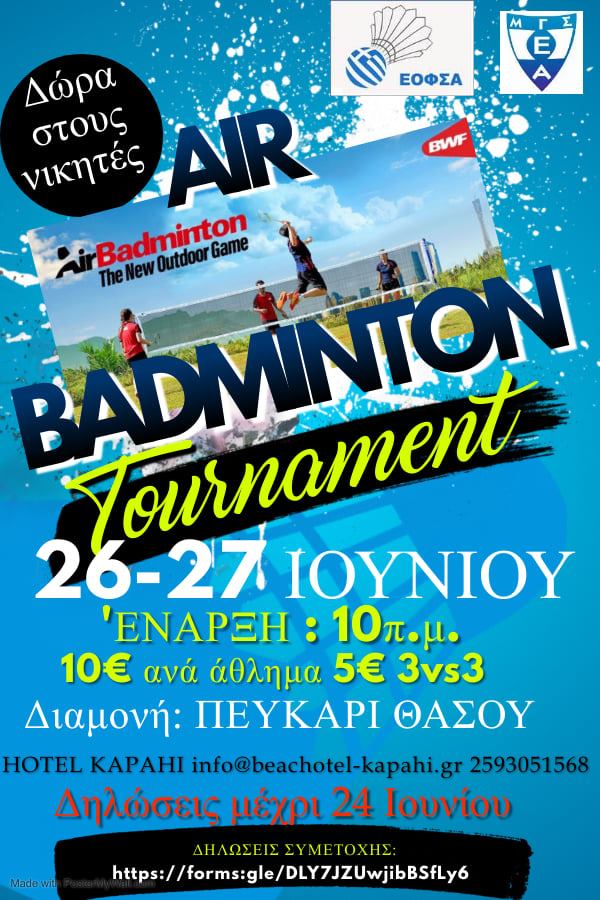 Το πρώτο πρωτάθλημα ερ μπάντμιντον στην Ελλάδα, είναι γεγονός. Ο ΜΓΣ Εθνικός Αλεξανδρούπολης σε συνεργασία με την ΕΟΦΣΑ, διοργανώνει το πρώτο αυτό τουρνουά στην όμορφη Θάσο στις 26 και 27 Ιουνίου. Η διαμονή θα είναι στο ξενοδοχείο Καπάχι στο Πευκάρι. Περισσότερες λεπτομέρειες στην αφίσα που συνοδεύει το άρθρο αυτό και για δηλώσεις συμμετοχής, μπορείτε να μπείτε εδώ. Επίσης για δρομολόγια πλοίων από Καβάλα προς Θάσο, μπορείτε να δείτε εδώ.