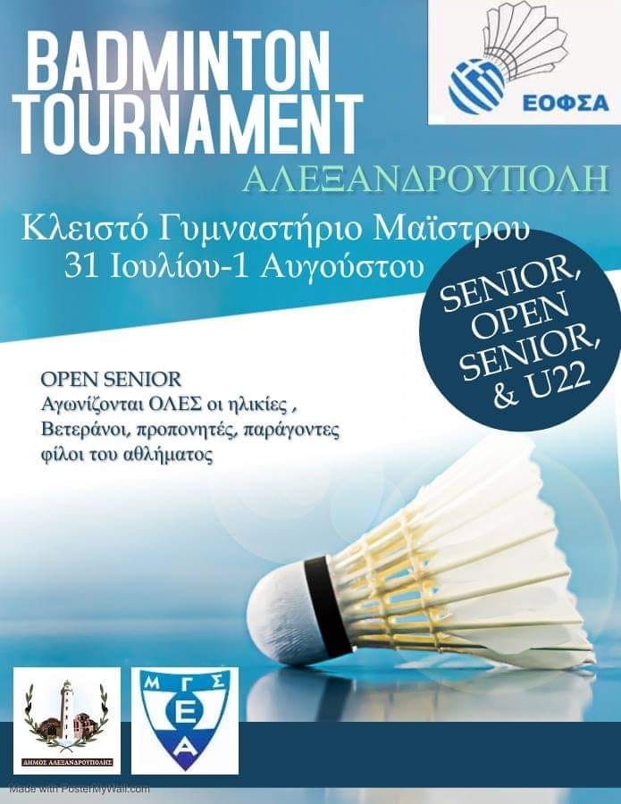 Αύριο και την Κυριακή, 31/7-1/8, θα λάβει χώρα στο Κλειστό Γυμναστήριο του Μαΐστρου στην Αλεξανδρούπολη, τα Τουρνουά Βετεράνων, ΟΠΕΝ Βετεράνων και U22 της ΕΟΦΣΑ. Συνεργάζονται ο Δήμος Αλεξανδρούπολης και το τοπικό σωματείο ΜΓΣ Εθνικός Αλεξανδρούπολης. Ευχόμαστε καλή επιτυχία!!!