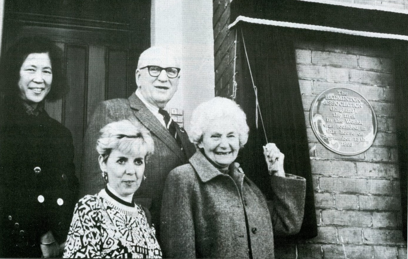 Ιστορική φωτογραφία από τα 100χρονα της Ομοσπονδίας το 1993, όπου αποκάλυψαν γαλάζια πλάκα στην πρόσοψη του κτιρίου που ιδρύθηκε η Ομοσπονδία το 1893. Από αριστερά είναι η τότε πρόεδρος της Παγκόσμιας Συνομοσπονδίας κυρία Λου Σενγκρόνγκ, η τότε δήμαρχος του Πόρτσμουθ Τζέιν Κόρνις, ο τότε πρόεδρος της Ομοσπονδίας Πίτερ Μπέρτγουιστλ και η τότε πρόεδρος της Ένωσης Μπάντμιντον του Χάμπσάιρ Πέγκι Σάντλερ. Εκείνη την ημέρα ακολούθησαν πολλές εκδηλώσεις. (πηγή: National Badminton Museum)