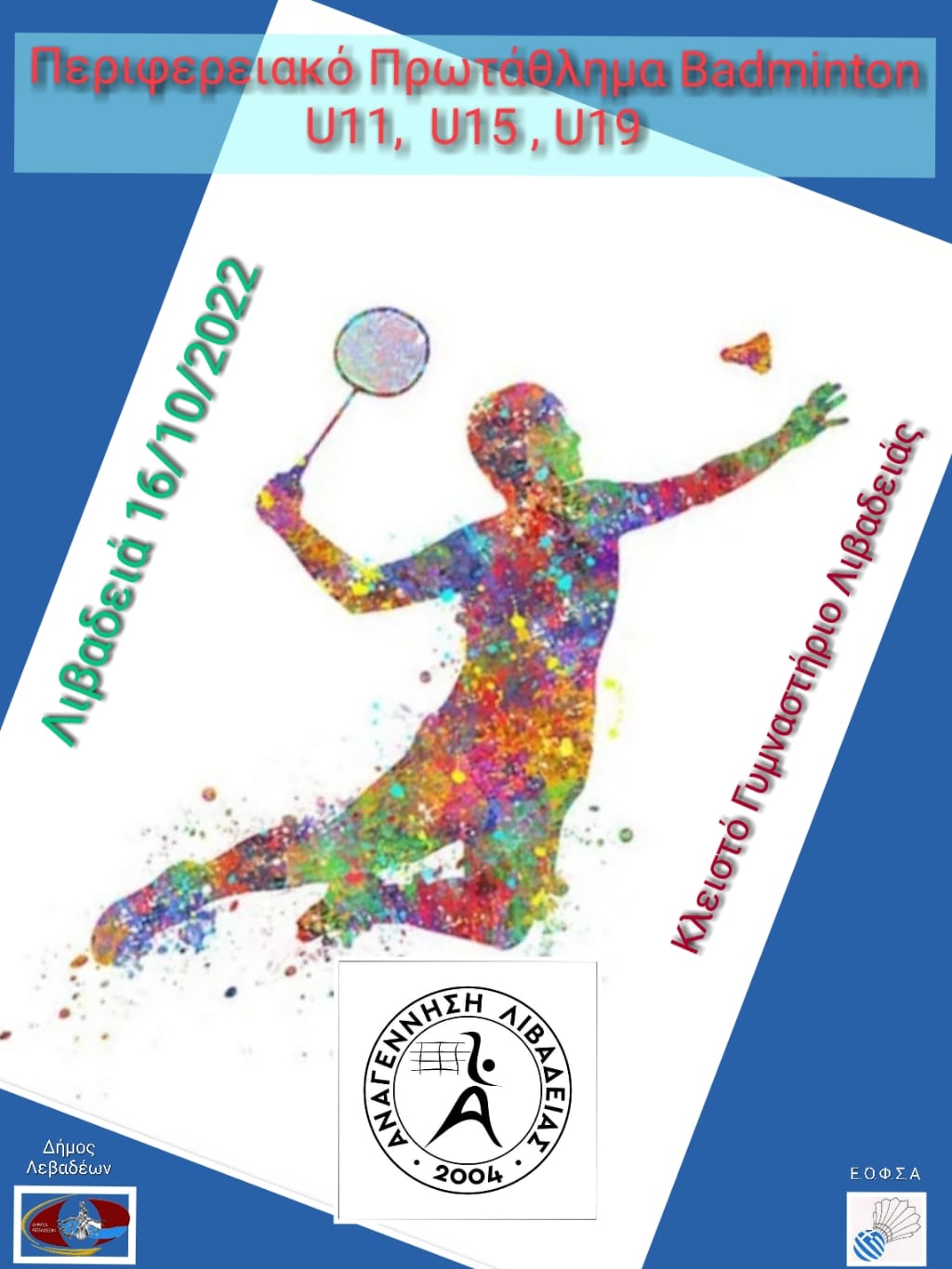 Στη Λιβαδειά θα πραγματοποιηθεί την Κυριακή 16 του μηνός, το Περιφερειακό Πρωτάθλημα U11-U15-U19, για την περιφέρεια Αττικής-Βοιωτίας-Ευβοίας της ΕΟΦΣΑ και συγκεκριμένα στο Κλειστό Γυμναστήριο της πόλης. Ευχόμαστε καλή επιτυχία!!!