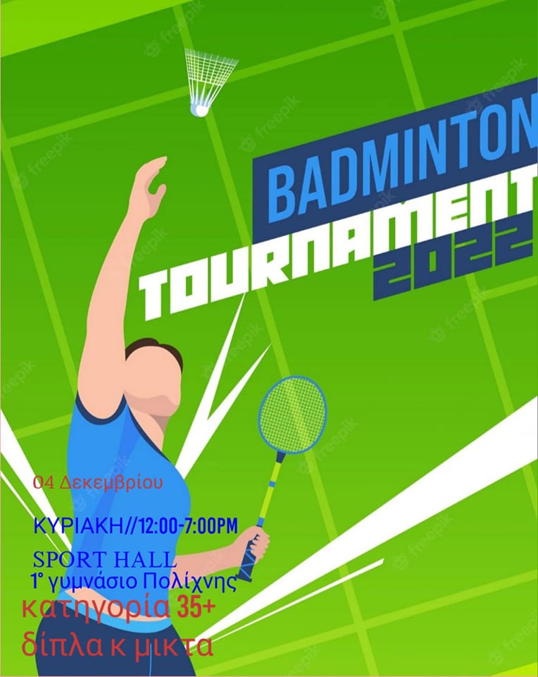 Τουρνουά βετεράνων 35+ πρόκειται να γίνει στο κλειστό γυμναστήριο του 1ου Γυμνασίου Πολίχνης Θεσσαλονίκης την Κυριακή 4 Δεκεμβρίου από τις 12 το μεσημέρι έως τις 7 το απόγευμα. Θα διεξαχθούν τα αγωνίσματα των διπλών και του μικτού. Ευχόμαστε καλή επιτυχία!!!