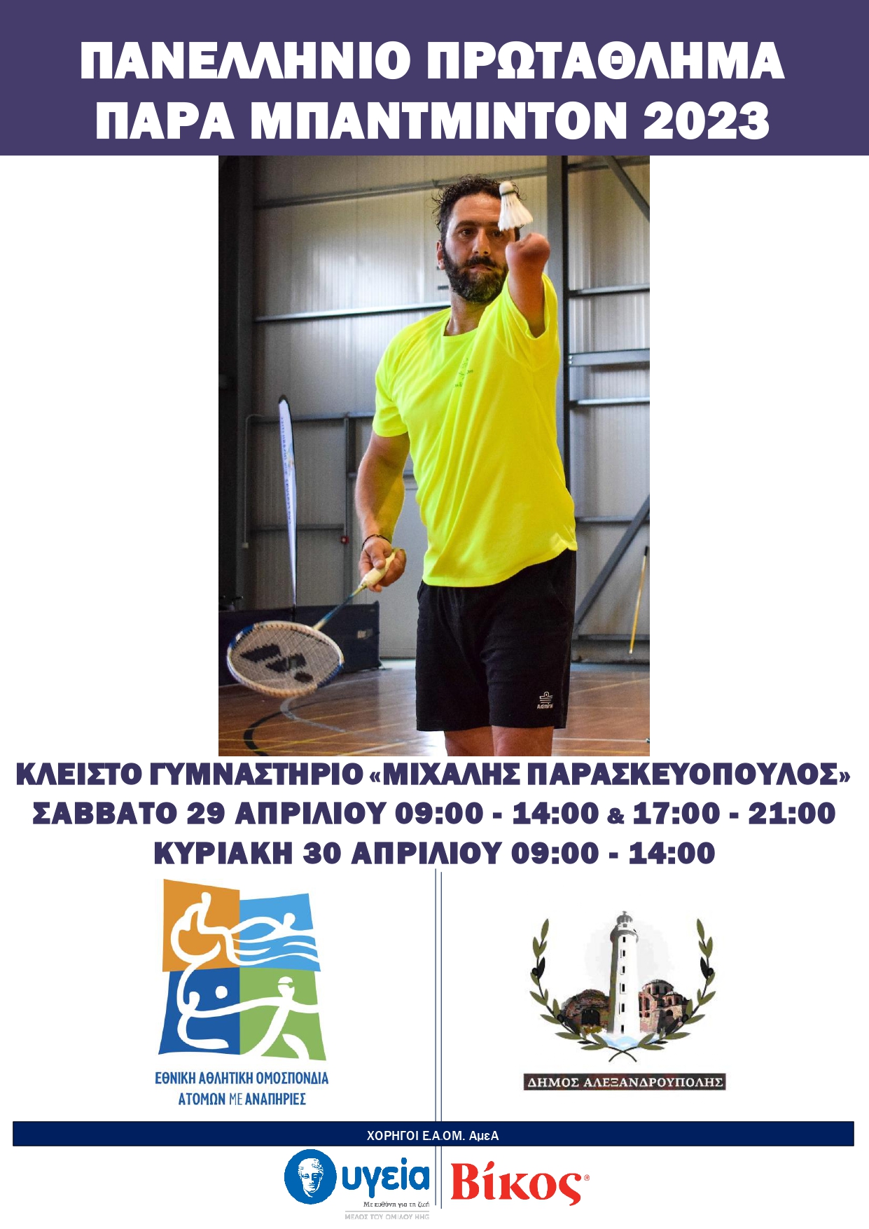 Στην Αλεξανδρούπολη, θα πραγματοποιηθεί και φέτος το Πανελλήνιο Πρωτάθλημα Παραμπάντμιντον. Θα λάβει χώρα στο Κλειστό Γυμναστήριο «Μιχάλης Παρασκευόπουλος» αύριο Σάββατο και μεθαύριο Κυριακή. Ευχόμαστε καλή επιτυχία!!!