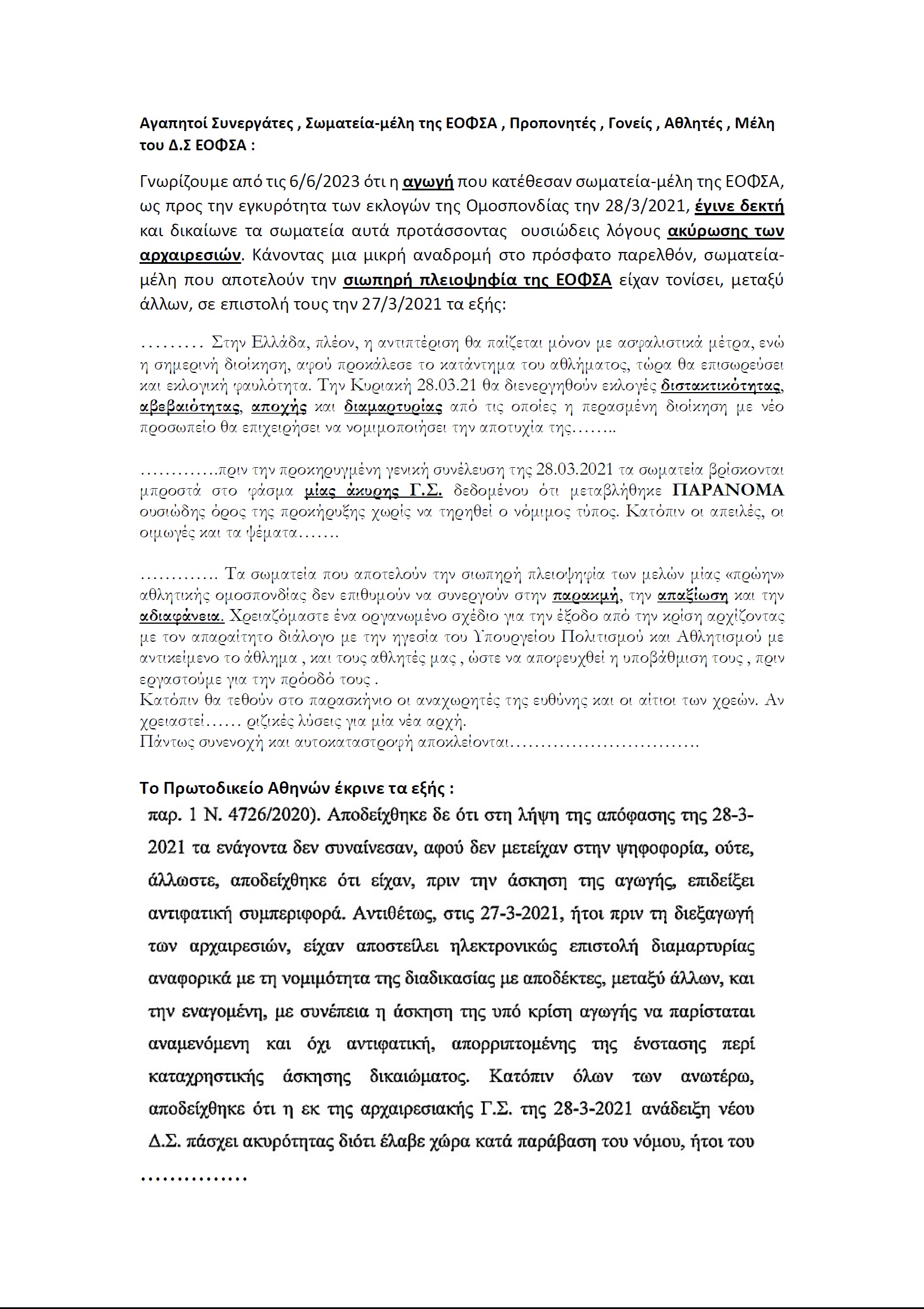 Με την από 6/6/2023 απόφασή του, το Μονομελές Πρωτοδικείο Αθηνών έκρινε άκυρες τις αρχαιρεσίες της ΕΟΦΣΑ που έγιναν στις 28/3/2021, μετά από αγωγή που κατατέθηκε στις 31/8/2021. Οι πληροφορίες λένε ότι θα έχουμε νέες αρχαιρεσίες το Σεπτέμβριο και, όπως όλα δείχνουν, θα έχουμε και την ερχόμενη χρονιά, δεδομένου ότι είναι Ολυμπιακή και σε κάθε Ολυμπιακό έτος γίνονται οι αρχαιρεσίες των αθλητικών Ομοσπονδιών. Δείτε το σχετικό άρθρο από την ιστοσελίδα Sportsfeed και παρακάτω την επιστολή της Κίνησης Αντιπτέρισης επί του θέματος.