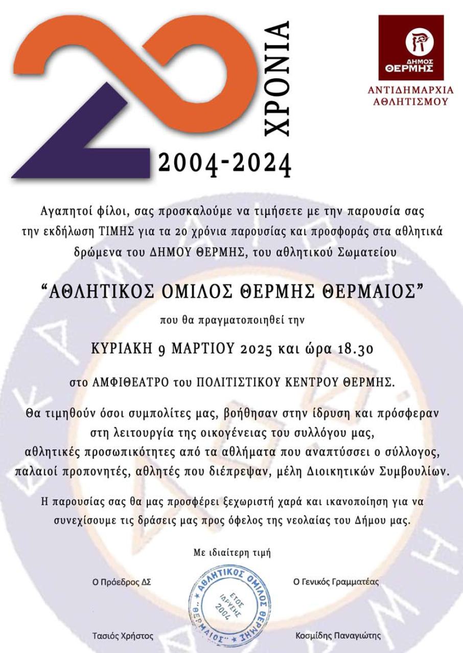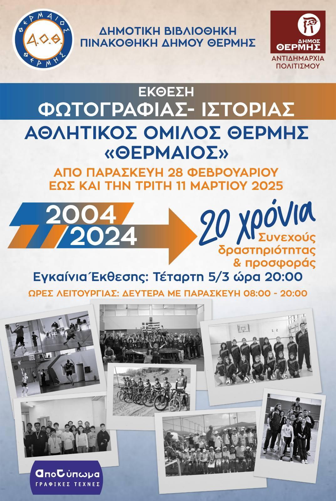 Εκδήλωση για τα 20 χρόνια παρουσίας του, πραγματοποιεί αύριο Κυριακή 9/3 ο Αθλητικός Όμιλος Θέρμης Θερμαίος, στο Πολιτιστικό Κέντρο Θέρμης. Θα υπάρχει και έκθεση φωτογραφικού υλικού από τη δράση του συλλόγου. Ευχόμαστε καλή επιτυχία!!!