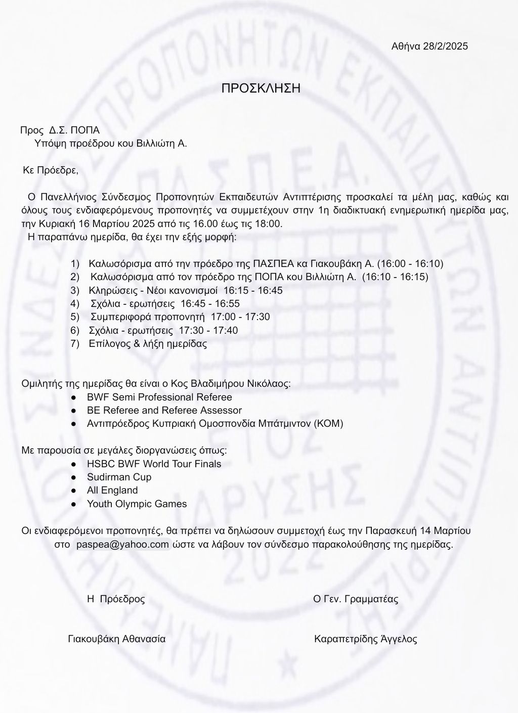 Εκπαιδευτική ημερίδα, θα πραγματοποιήσει ο Πανελλήνιος Σύνδεσμος Προπονητών Εκπαιδευτών Αντιπτέρισης, την Κυριακή 16/3, για τα μέλη του και τους προπονητές μπάντμιντον. Παρακάτω, η ανακοίνωση που δημοσιοποιήθηκε.