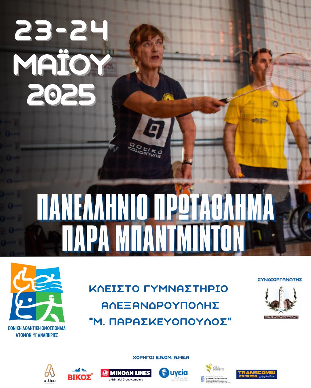 Το Πανελλήνιο Πρωτάθλημα Παραμπάντμιντον φιλοξενεί σήμερα και αύριο η Αλεξανδρούπολη, στο Κλειστό «Μιχάλης Παρασκευόπουλος». 20 αθλητές και αθλήτριες από 6 συλλόγους, παίρνουν μέρος στο τουρνουά που αφορά τις ηλικιακές κατηγορίες Ανδρών-Γυναικών και Εφήβων-Νεανίδων. Ευχόμαστε καλή επιτυχία!!!
