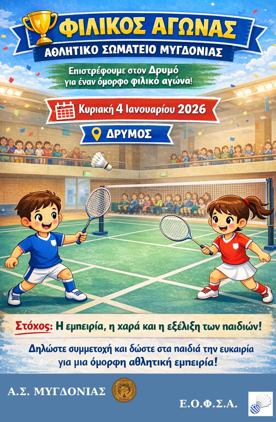 Φιλικό τουρνουά στο Δρυμό Θεσσαλονίκης, θα πραγματοποιήσει στις 4 Ιανουαρίου, ο Αθλητικός Σύλλογος Μυγδονίας, σε συνεργασία με την ΕΟΦΣΑ. Οι αγώνες αφορούν παιδικά τμήματα, αλλά θα υπάρξει και συμμετοχή 8 Ελλήνων και 1 Μαλαισιανού, που θα λάβουν μέρος σε αγώνες υψηλού επιπέδου, στο πλαίσιο του τουρνουά. Συγκεκριμένα θα είναι οι: Ikmal Hussain Jaafar (Μαλαισία), Σταμάτης Τσιγκιρδάκης (ΟΑΓΩ), Βαγγέλης-Σταύρος Αναστασίου (ΕΑΤΕΚ), Ζήσης Πέγιος (ΕΑΤΕΚ), Αχιλλέας Τσαρτσίδης (ΡΟΥΠΕΛ), Δημήτρης Παπαδόπουλος (ΡΟΥΠΕΛ), Θοδωρής Παπαδόπουλος (ΡΟΥΠΕΛ), Ορέστης Χοτουμανίδης (ΔΙΑΣ Σιδηροκάστρου) και Γιάννης Σαρουγιαννίδης (ΡΟΥΠΕΛ). Ευχόμαστε καλή επιτυχία!!!