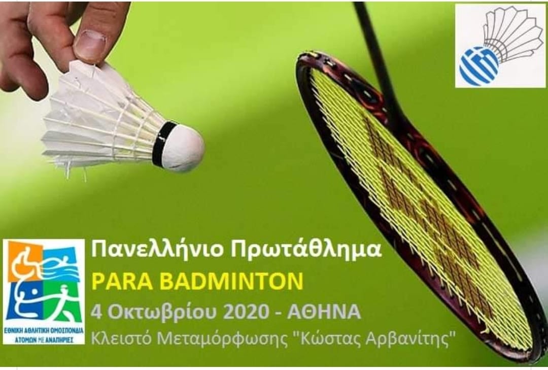 Πανελλήνιο πρωτάθλημα παραμπάντμιντον, θα πραγματοποιηθεί στις 4 Οκτωβρίου στο Κλειστό Γυμναστήριο Μεταμόρφωσης «Κώστας Αρβανίτης» στην Αθήνα. Το τουρνουά γίνεται σε συνεργασία με την ΕΟΦΣΑ και την ΕΑΟΜ-ΑμεΑ. Ευχόμαστε καλή επιτυχία!!!